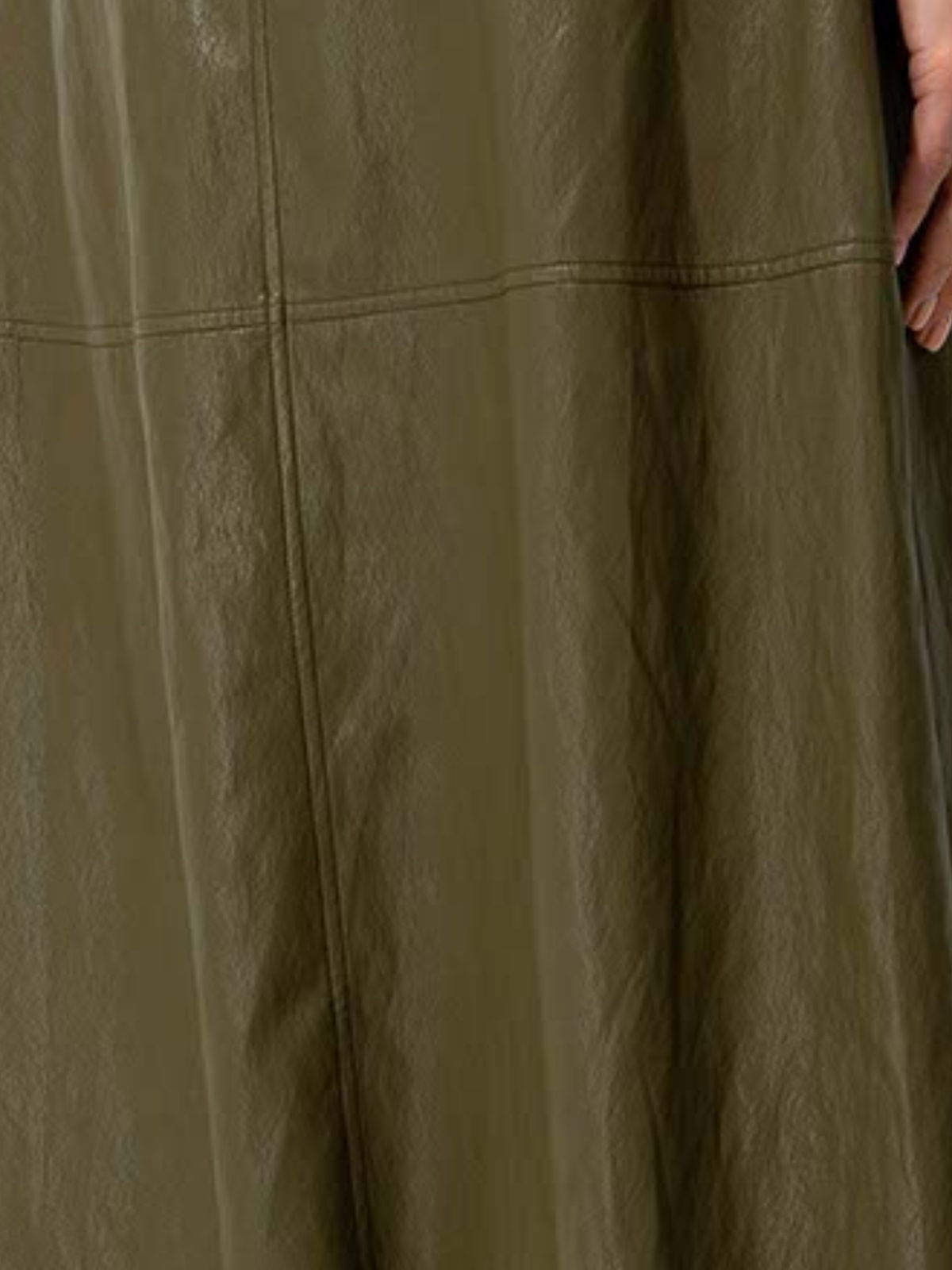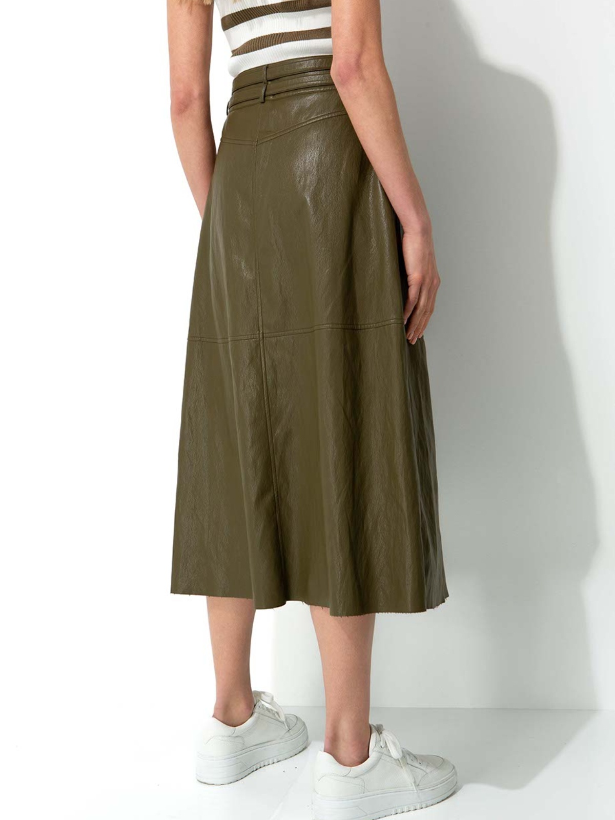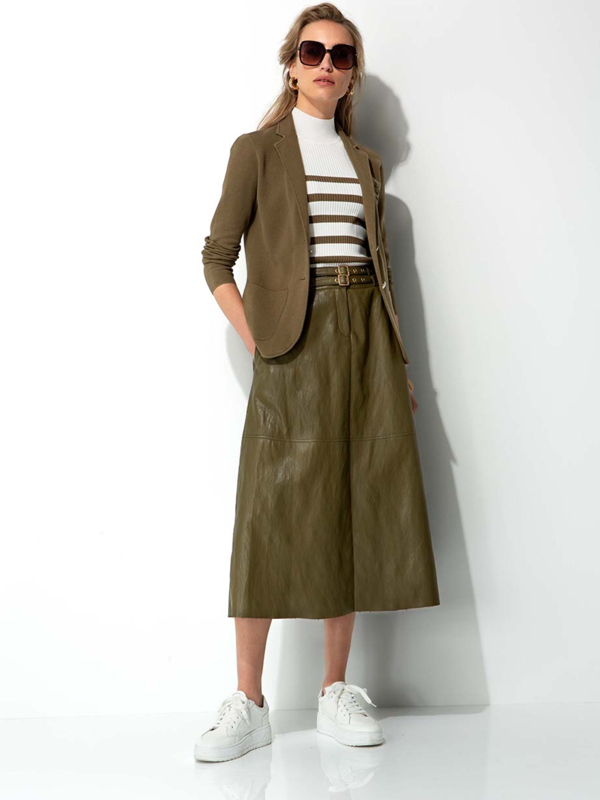 Stylová khaki sukně midi délky v áčkovém střihu ozdobená dvojitým páskem. Materiál imitující lůži je překvapivě lehký a poddajný. Skvěle doplníte pruhovanými topy ze stejné kolekce.