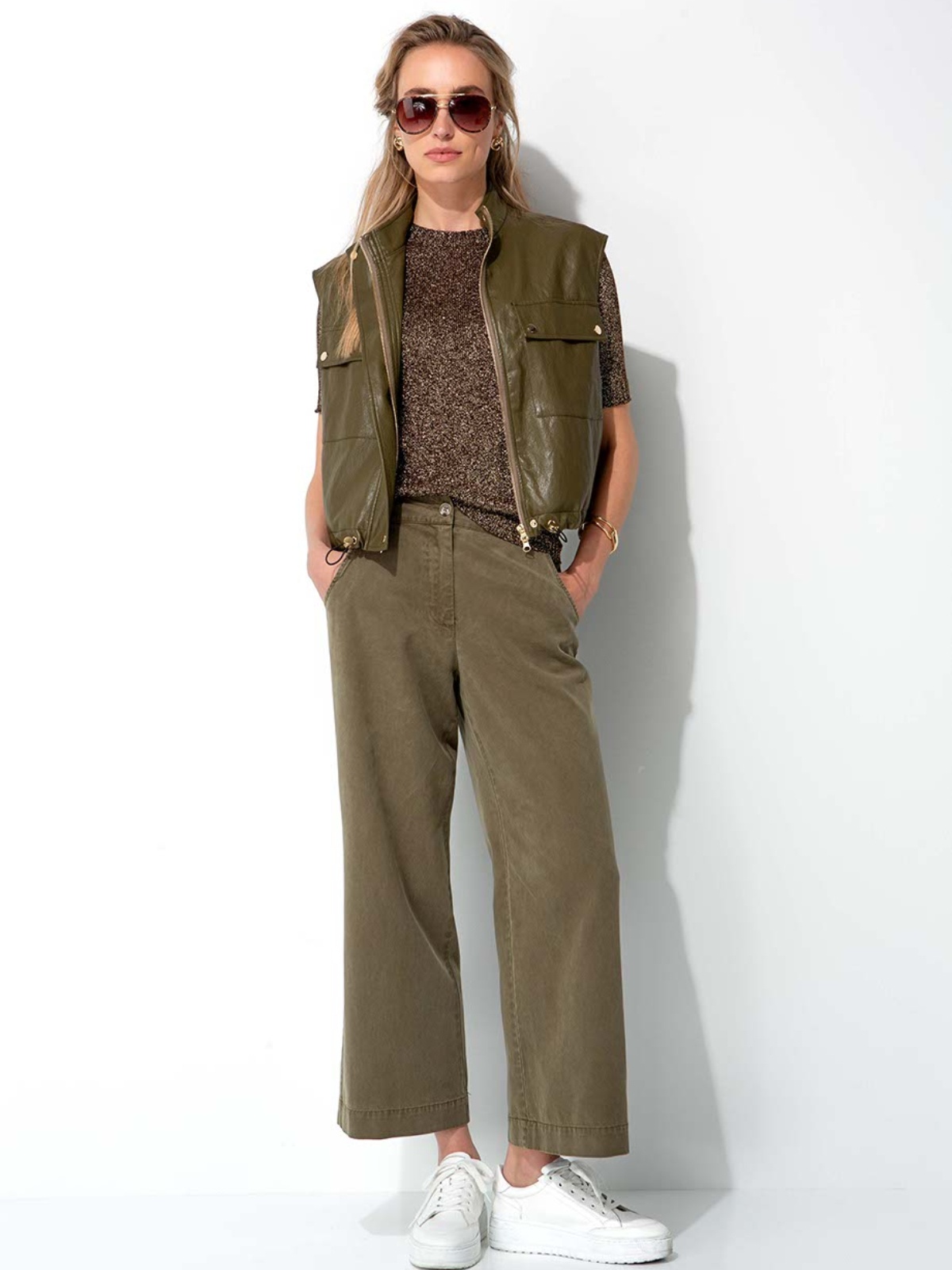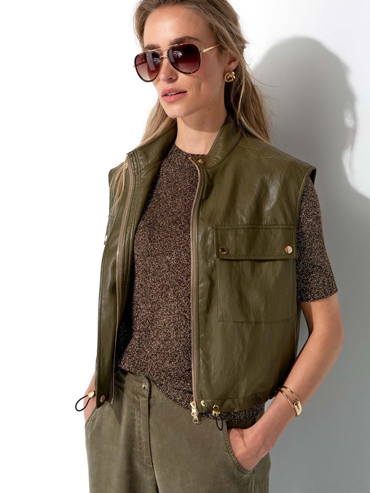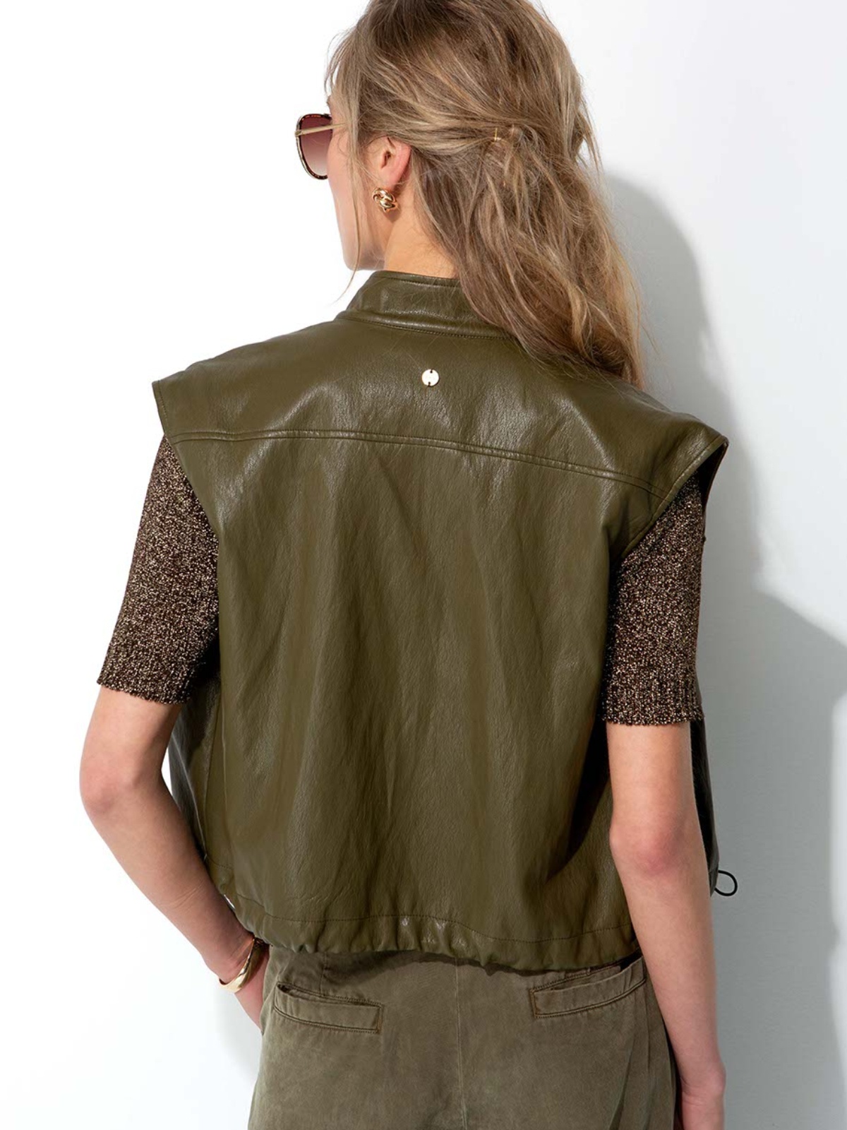 Elegantní khaki vesta z prémiového koženkového materiálu je stylovým doplňkem pro trendy vrstvení a vytvoření originálního looku.